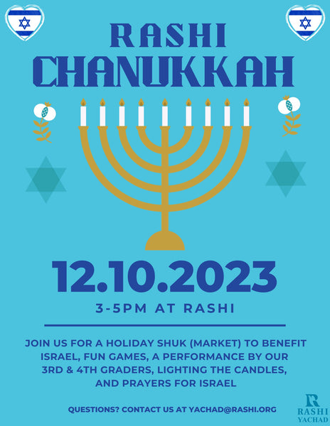 These items will first be available for sale at the Rashi Chanukah Event on December 10th (see flyer above), 20% of these sales will go to the CJP Israel Emergency Fund. Please do not add these to cart.